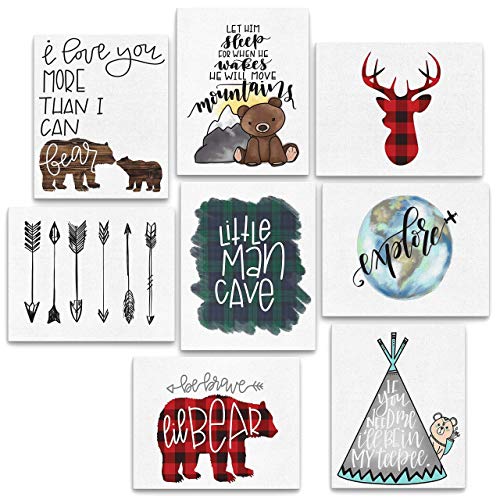 • 8 PIECE CARDSTOCK PRINTS - NO FRAME IS INCLUDED. Set of 8 Woodland Animal Nursery cardstock prints reproduced from my original digital graphic designs. Add a little whimsy and a little decor to any little boy's nursery with our eight piece graphic "Little Man Cave" "Deer Silhouette" "I love You More Than I Can Bear" "Explore" "Let Him Sleep" "Be Brave Little Bear" "I'll Be In My Teepee" and "Arrow" prints.