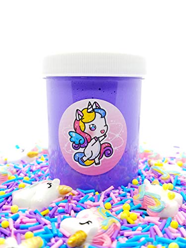 This is a creamy softr butter slime made with soft clay and is layered with purple and pinks ,scented sugar crush topped with a beautiful bright unicorn blend of sprinkles and glitters !