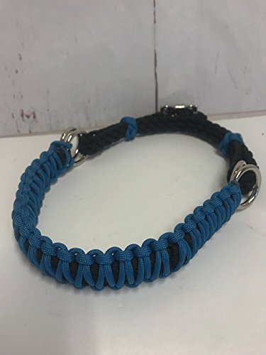 This is a braided side pull hackamore attachment that attaches to your own headstall. It is braided out of a high quality black 550 paracord with a carribean blue noseband. The headstall attaches to one set of rings and your reins attach to the other set. This one does not tighten down on the nose when the reins are pulled back. The chinstrap is adjustable with a roller buckle. The noseband is carribean blue and the chinstrap is black.